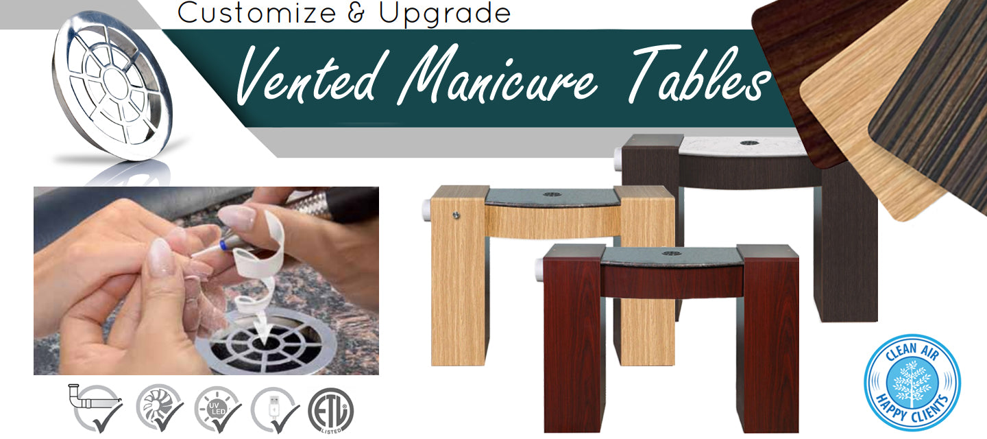 Vented pedicure chairs and manicure tables are the perfect way to reduce odor, eliminate nail dust, and remove toxins. This added feature is not only now a mandatory code in several States, but also highly important for the health of all employees.