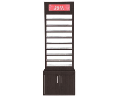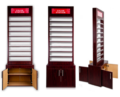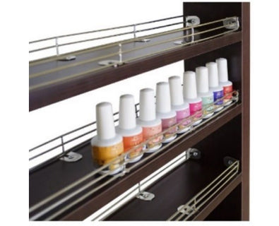 ANS Freestanding polish stand is available in both standard and upgrades laminates. The stand offers generous storage with the bottom cabinet. Features modern hardware on cabinet and see through wire for reading brands and labels. Stands out in your salon and 2 customers can select colors at the same time. Each shelf holds 2 x rows and is handcrafted to your selected laminate.