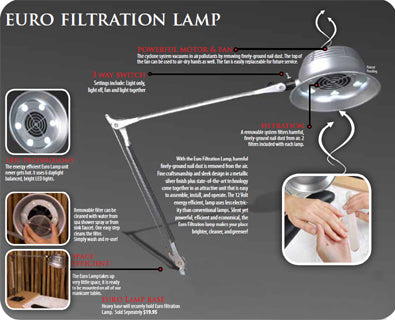 A removable system filters harmful, finely-ground nail dust from air. 2 filters included with each lamp. The Energy Efficient Euro Lamp unit never gets hot. It uses 6 daylight balanced, bright LED lights. The Euro Lamp takes up very little space, it is ready to be mounted to accommodating manicure tables.
