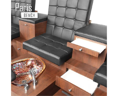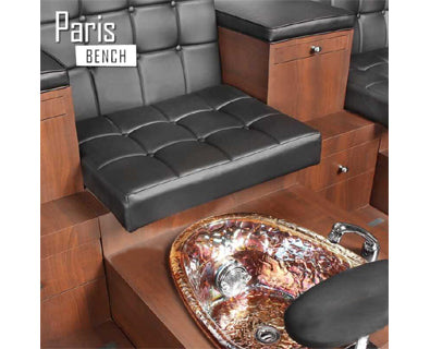 Paris Pedicure Bench station is one of the top pedicure spas in the marketplace. Features include adjustable footrest, heat function, vibrate massage and pipeless whirlpool creating the perfect spa. Select from several glass, upholstery and laminate colors to design your own. Available in single, double, and triple stations.