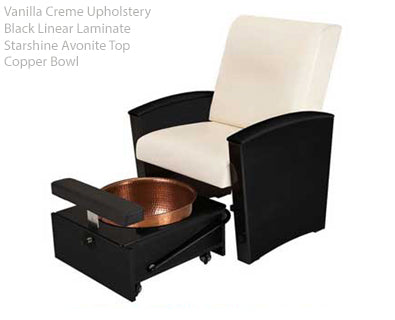 No Plumbing, no problem! The Mystia no plumbing pedicure chair is one our most luxurious pedicure spas which features a removable copper pedicure bowl that makes it easy to fill, clean and drain. The tuckaway design is perfect for smaller salons, treatment rooms, or any spa with space restrictions as the pedicure unit tucks right underneath the chair. Upgrade the Mystia with the Relaxor option which offers a heat & vibrate massage or add the upgraded assisted tilt option.