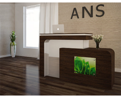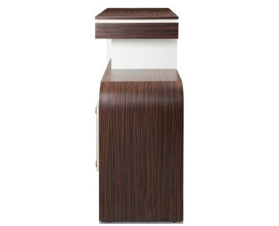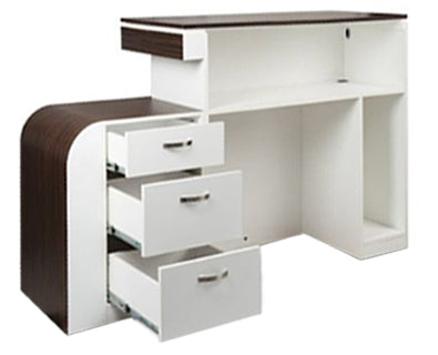 Meridian SpasThe Beniko is the perfect salon reception designed with functionality in mind. This quality desk features a unique style with convenient storage compartments and pullout drawers. The receptionist can sit comfortably with the generous let room and considerable work space. Pullout drawers come with modern hardware and easy glide rails. It's two tone color combination is rose wood accented with a white accent.