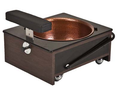 The Copper Pedicure Tuckaway is the perfect solution for treatment rooms or small salons with limited space. The copper bowl creates an upscale ambiance while the tuckaways low profile design makes it a practical portable spa. Model comes complete with copper, tuckaway cart, footrest & carry handle. Variety of stains, laminates and Avonite tops to choose from.