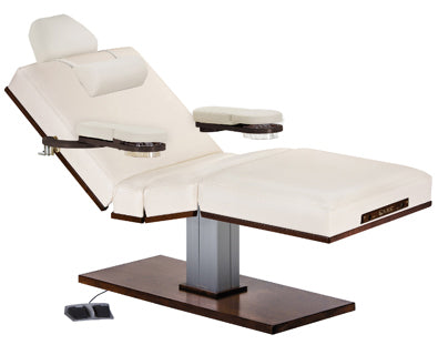 The UL Listed, Sleek Single Pedestal Electric Lift is Whisper quiet and ultra reliable with its electric actuator for on-demand height adjustments. The Pedestal Features a low profile hardwood base with matching accent trim. The Pedestals Squared corners allow for an expanded work surface and comfort or tapered ends for progressive style with ultimate client access. Available in several upholstery and stain color options.