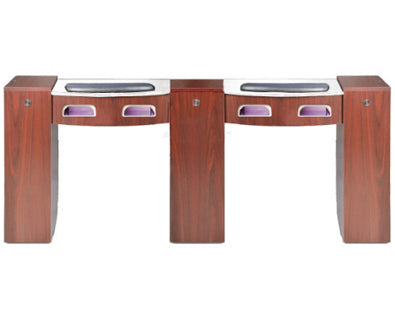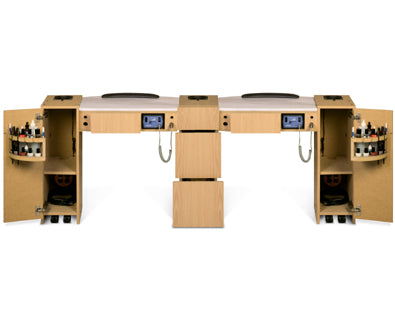 The UV Gel table comes with built-in uv gel lights and a large selection of laminates to create your own manicure station. Lights are 36W with an auto on/off sensor. Optional nail drying fan can be installed on both stations. Plenty of storage and great for organization. Includes two wrist pad for clients.